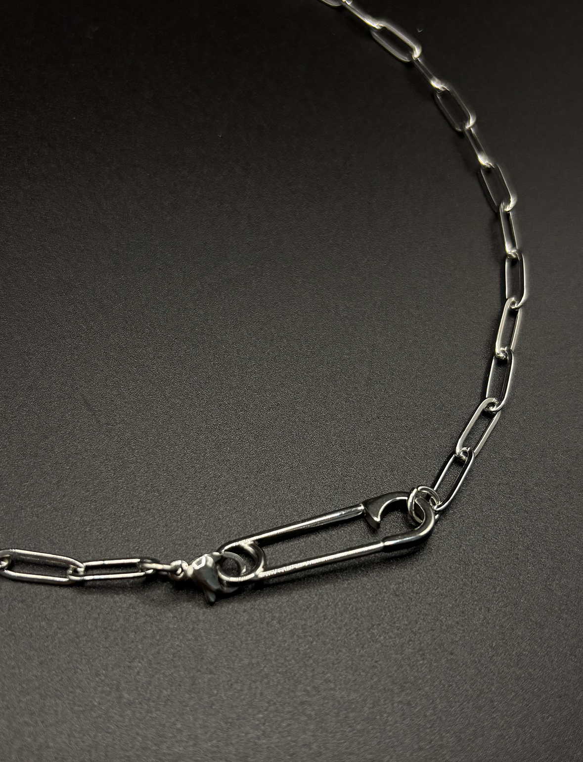 FAILSAFE_01 is a sleek, stainless steel chain necklace featuring an industrial-style safety pin clasp — a functional accent that nods to DIY rebellion and soft-punk resilience.