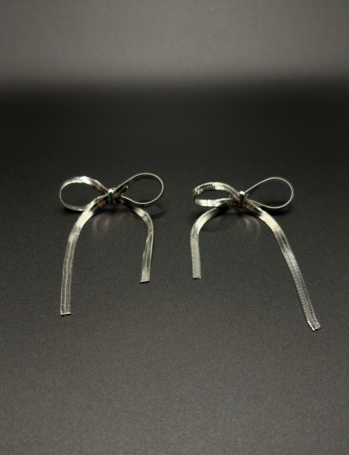 Steel romance reimagines softness through the lens of resilience — sculptural bow earrings made from sleek stainless snake chain. The loops are graceful, the tails long and fluid, but the material tells another story: this softness has structure.